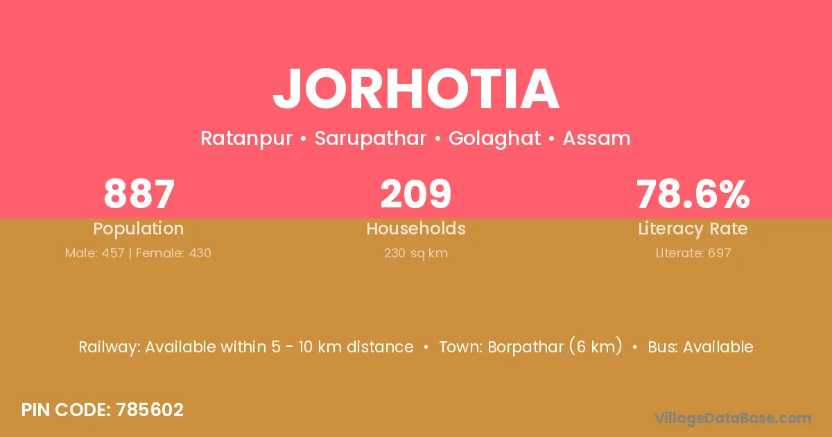 Borpathar (6 km) is the nearest town to Jorhotia village for major economic activities and is located approximately 6 km away.