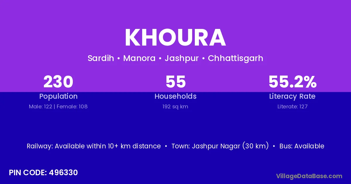 The literacy rate of Khoura village is 60.30%. Male literacy stands at 66.22% and female literacy at 54.30%.