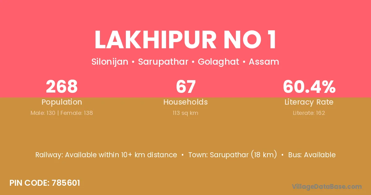 Sarupathar (18 km) is the nearest town to Lakhipur No 1 village for major economic activities and is located approximately 18 km away.