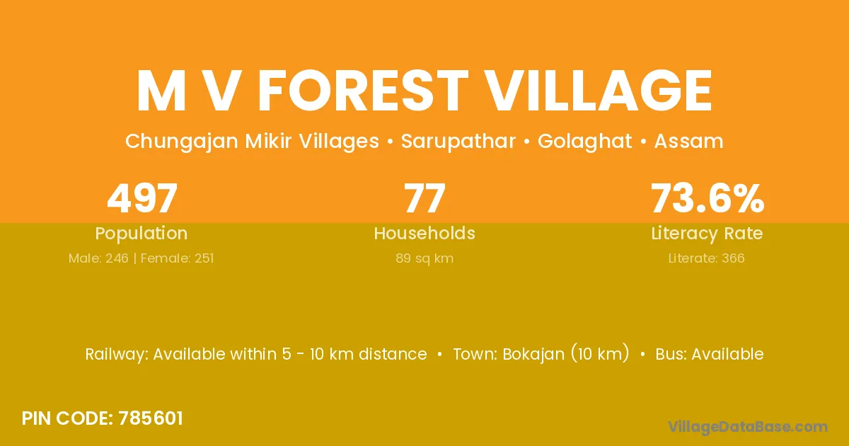 Bokajan (10 km) is the nearest town to M V Forest Village village for major economic activities and is located approximately 10 km away.