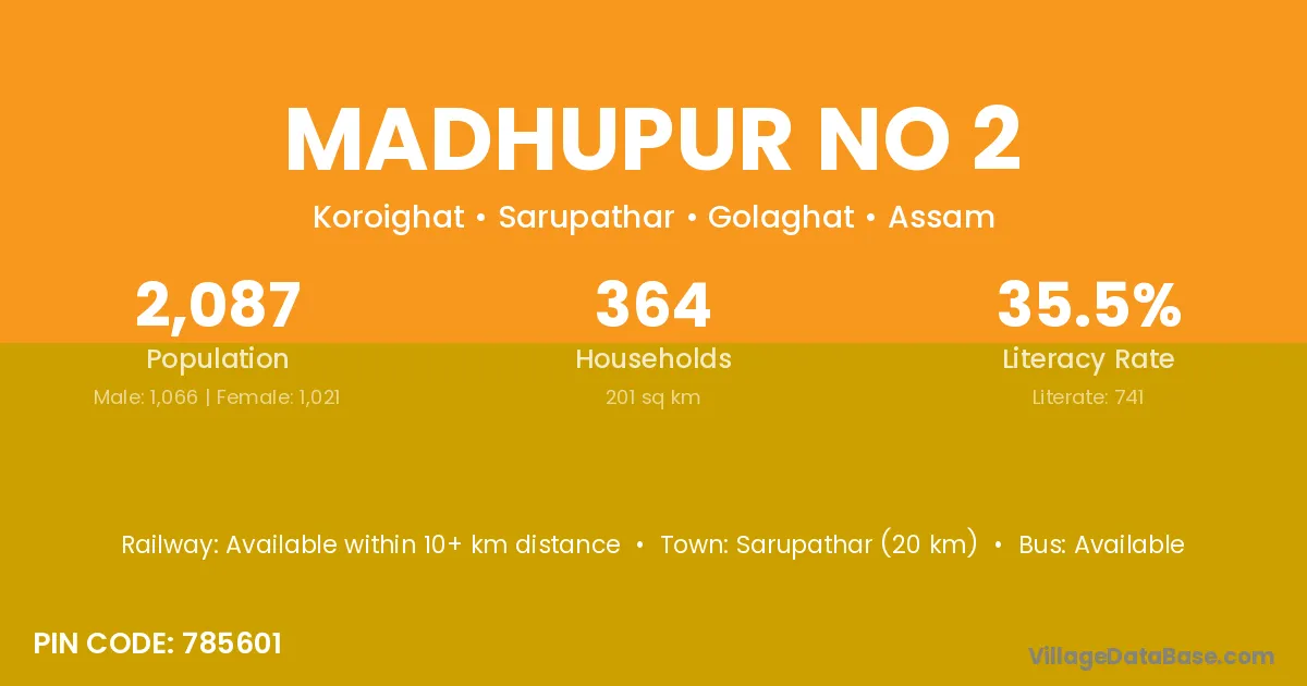 Sarupathar (20 km) is the nearest town to Madhupur No 2 village for major economic activities and is located approximately 20 km away.