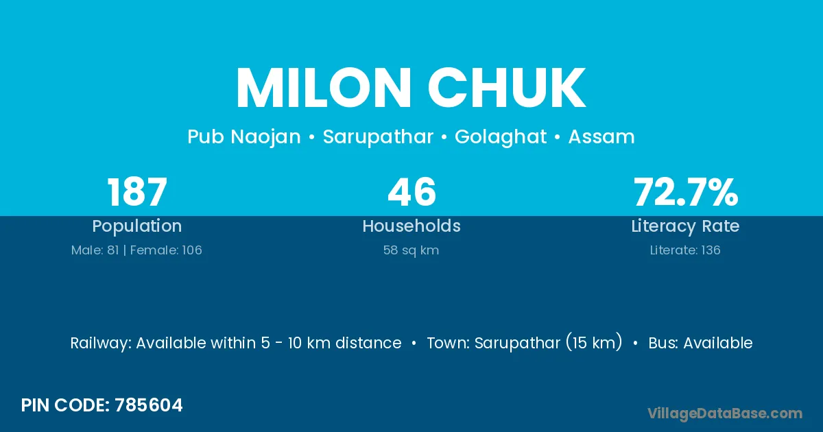 Sarupathar (15 km) is the nearest town to Milon Chuk village for major economic activities and is located approximately 15 km away.