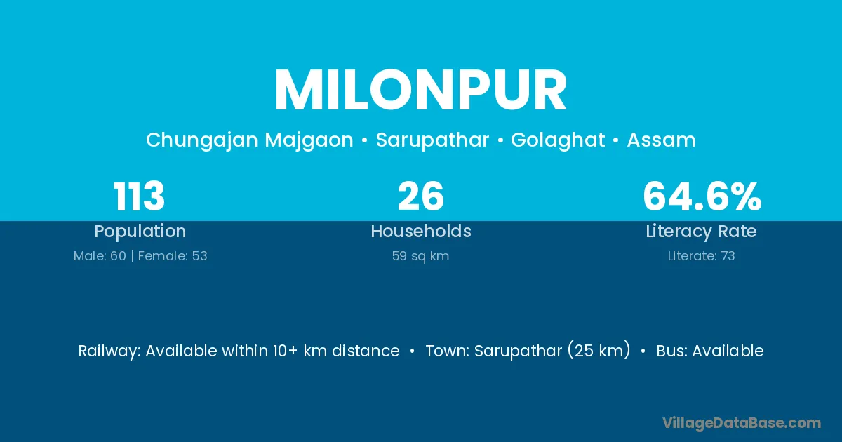 Milonpur village has a total population of 113 people, of which 60 are males and 53 are females.