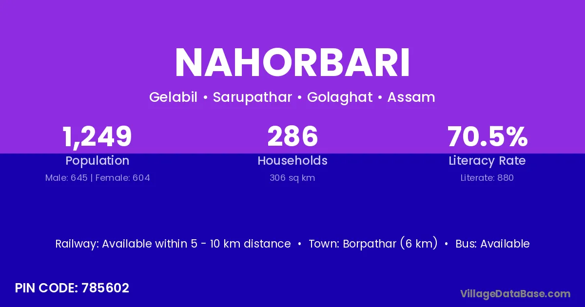 Borpathar (6 km) is the nearest town to Nahorbari village for major economic activities and is located approximately 6 km away.
