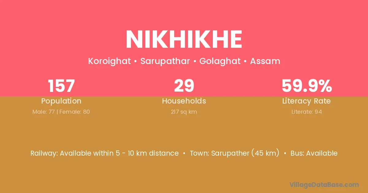 Sarupather (45 km) is the nearest town to Nikhikhe village for major economic activities and is located approximately 45 km away.