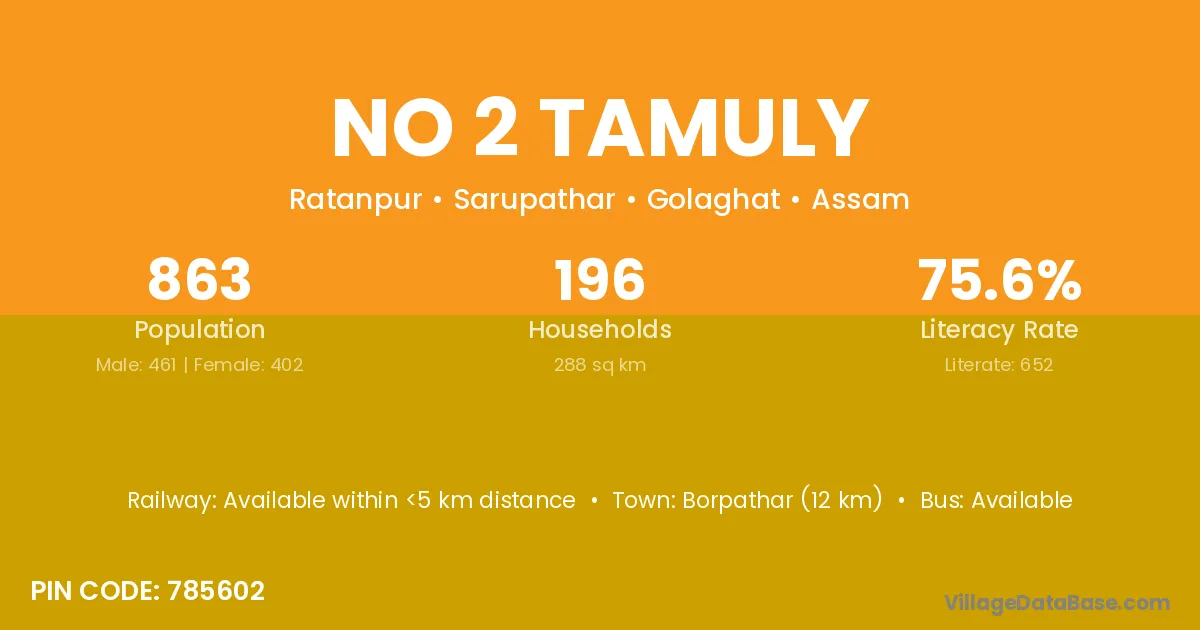 Borpathar (12 km) is the nearest town to No 2 Tamuly village for major economic activities and is located approximately 12 km away.
