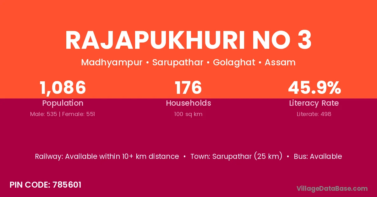 Rajapukhuri No 3 village has a total population of 1,086 people, of which 535 are males and 551 are females.