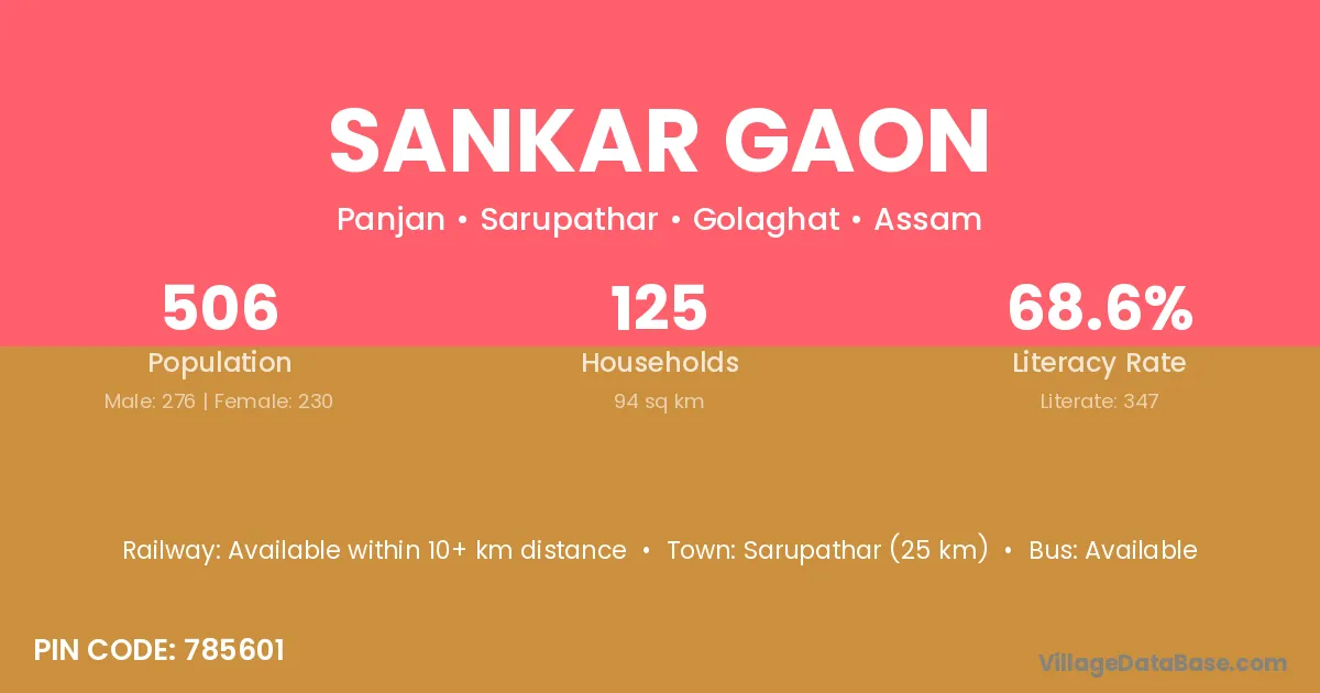 Sankar Gaon village has a total population of 506 people, of which 276 are males and 230 are females.
