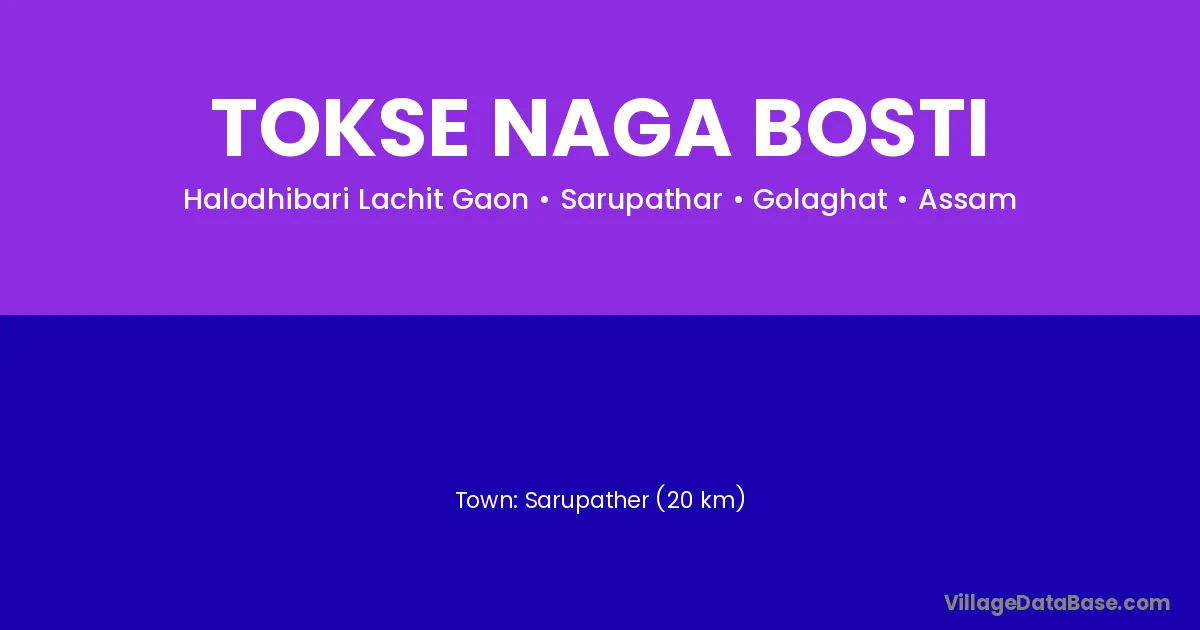 Sarupather (20 km) is the nearest town to Tokse Naga Bosti village for major economic activities and is located approximately 20 km away.