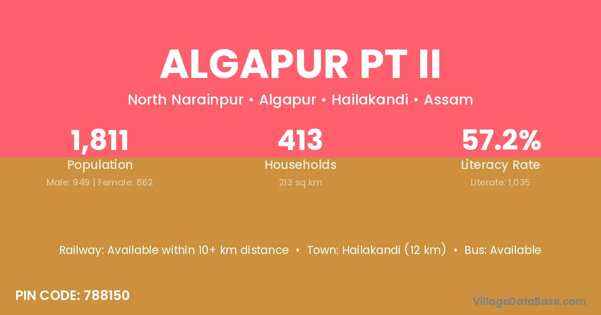 Hailakandi (12 km) is the nearest town to Algapur Pt Ii village for major economic activities and is located approximately 12 km away.