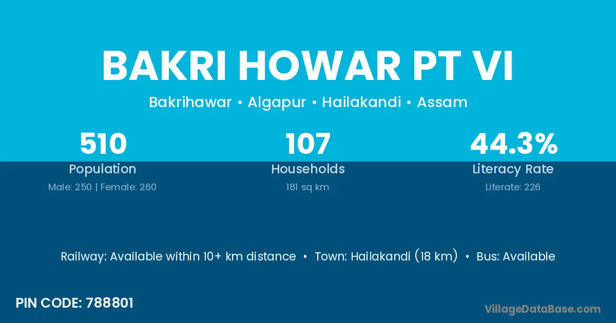 Hailakandi (18 km) is the nearest town to Bakri Howar Pt Vi village for major economic activities and is located approximately 18 km away.