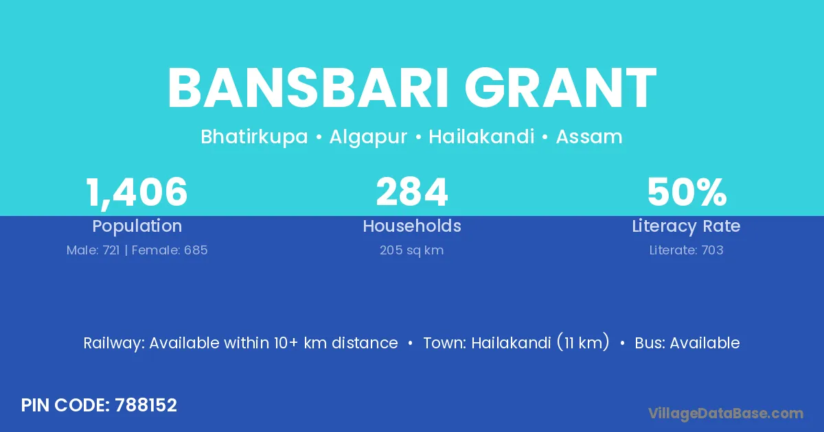 Hailakandi (11 km) is the nearest town to Bansbari Grant village for major economic activities and is located approximately 11 km away.