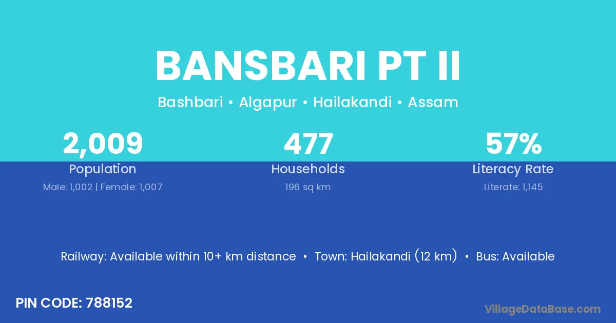 Hailakandi (12 km) is the nearest town to Bansbari Pt Ii village for major economic activities and is located approximately 12 km away.