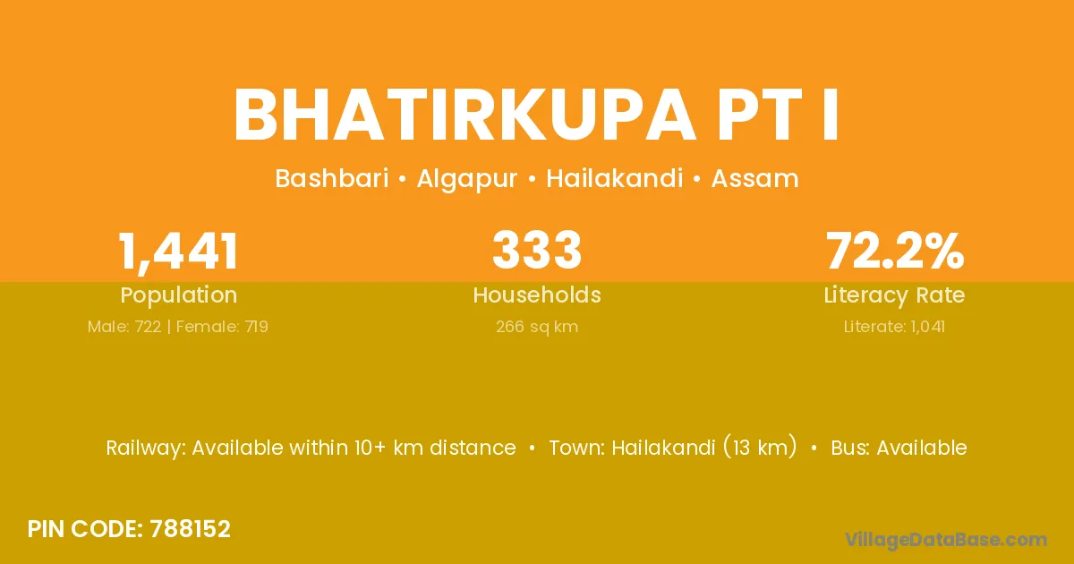 Hailakandi (13 km) is the nearest town to Bhatirkupa Pt I village for major economic activities and is located approximately 13 km away.