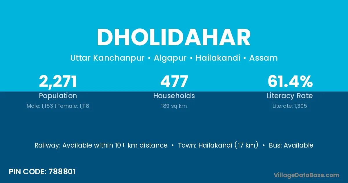 Hailakandi (17 km) is the nearest town to Dholidahar village for major economic activities and is located approximately 17 km away.