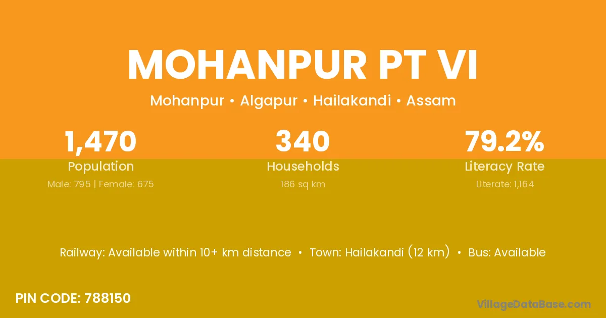 Hailakandi (12 km) is the nearest town to Mohanpur Pt Vi village for major economic activities and is located approximately 12 km away.