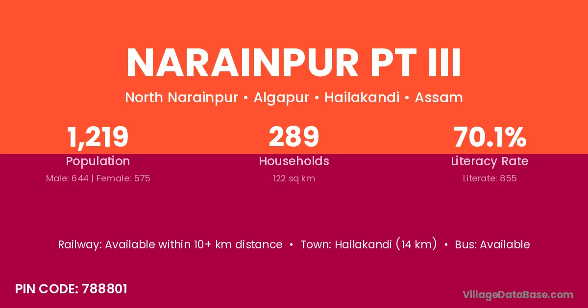 Hailakandi (14 km) is the nearest town to Narainpur Pt Iii village for major economic activities and is located approximately 14 km away.