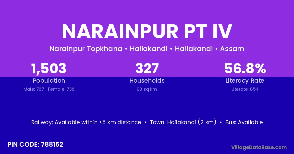 Hailakandi (18 km) is the nearest town to Narainpur Pt Iv village for major economic activities and is located approximately 18 km away.