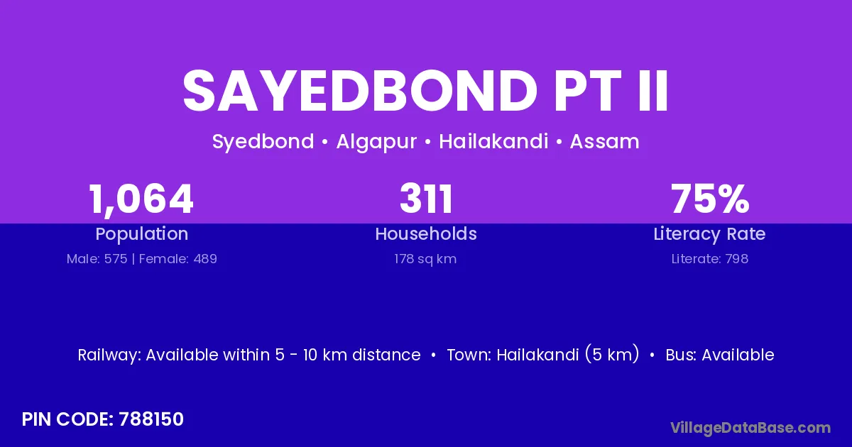 Hailakandi (5 km) is the nearest town to Sayedbond Pt Ii village for major economic activities and is located approximately 5 km away.