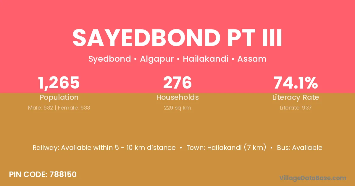 Hailakandi (7 km) is the nearest town to Sayedbond Pt Iii village for major economic activities and is located approximately 7 km away.