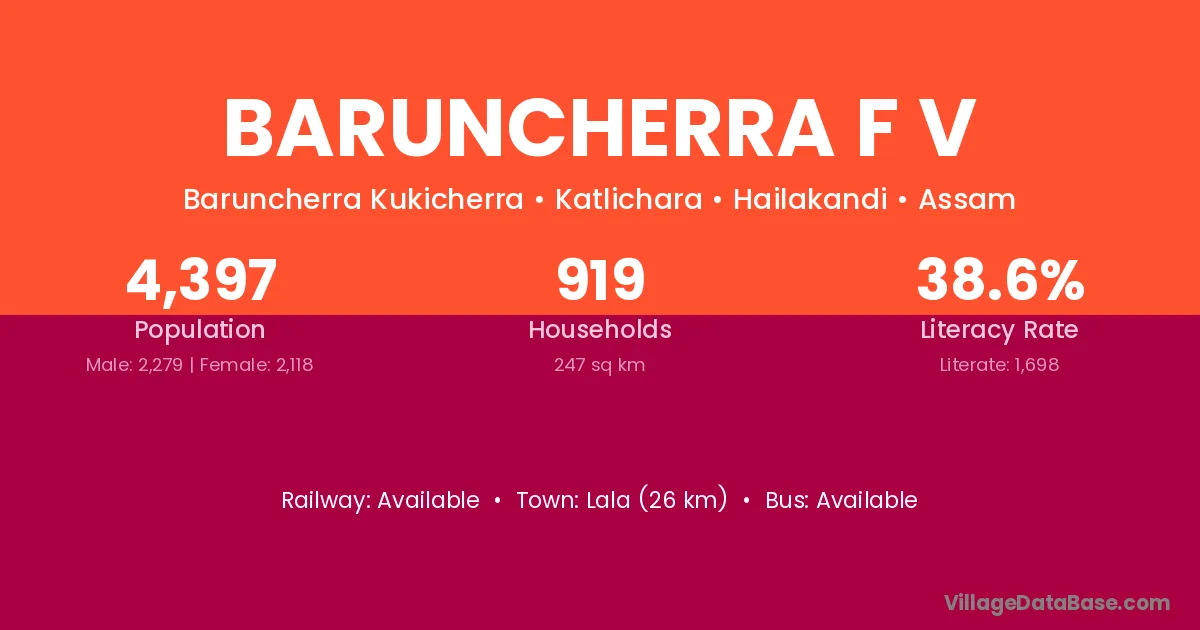 Lala (26 km) is the nearest town to Baruncherra F V village for major economic activities and is located approximately 26 km away.
