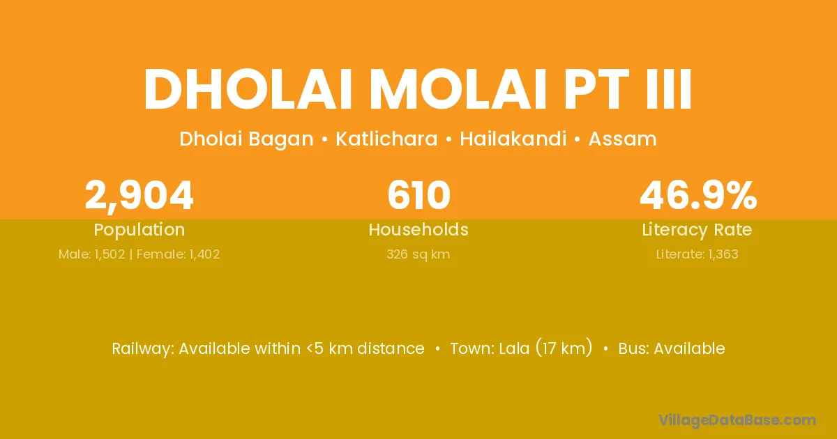 Lala (17 km) is the nearest town to Dholai Molai Pt Iii village for major economic activities and is located approximately 17 km away.