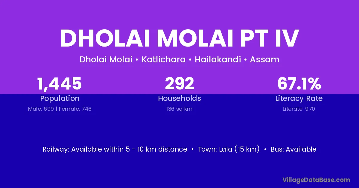 Dholai Molai Pt Iv village has a total population of 1,445 people, of which 699 are males and 746 are females.