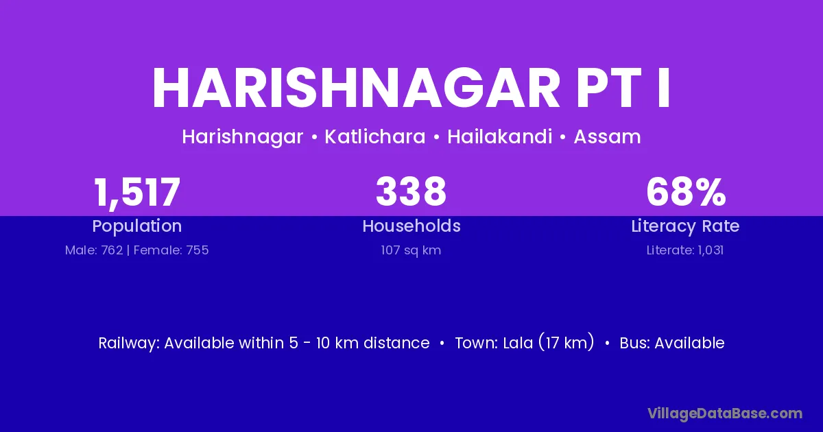 Harishnagar Pt I village has a total population of 1,517 people, of which 762 are males and 755 are females.