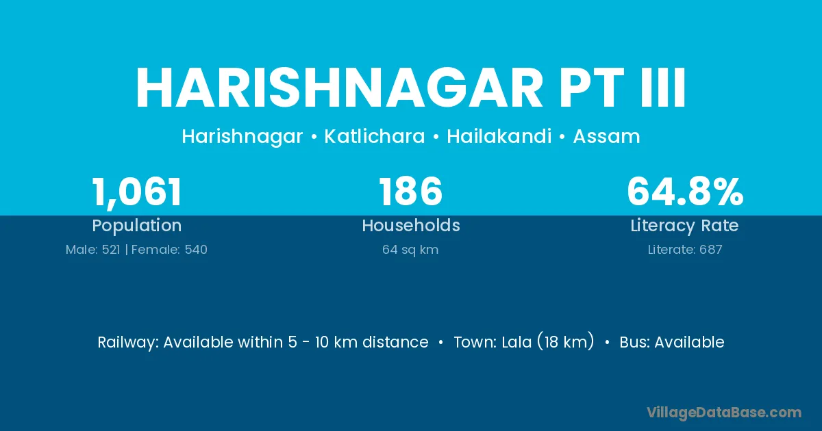 Lala (18 km) is the nearest town to Harishnagar Pt Iii village for major economic activities and is located approximately 18 km away.