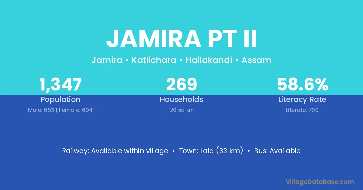 Lala (33 km) is the nearest town to Jamira Pt Ii village for major economic activities and is located approximately 33 km away.