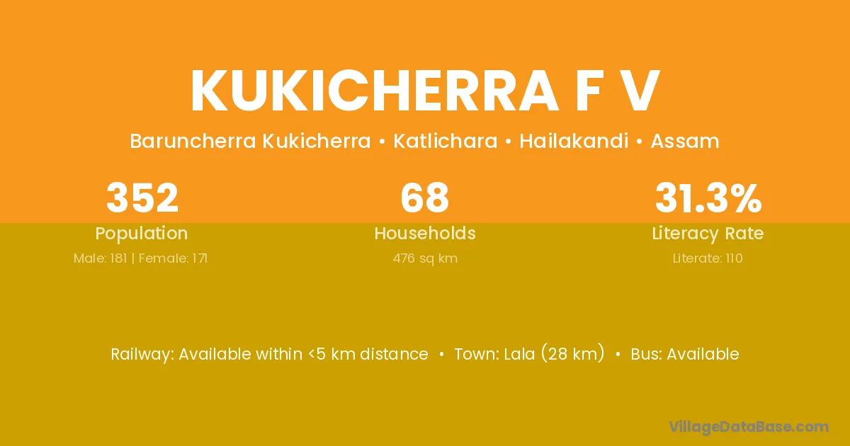 Lala (28 km) is the nearest town to Kukicherra F V village for major economic activities and is located approximately 28 km away.