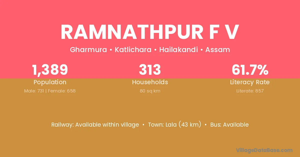 Ramnathpur F V village has a total population of 1,389 people, of which 731 are males and 658 are females.