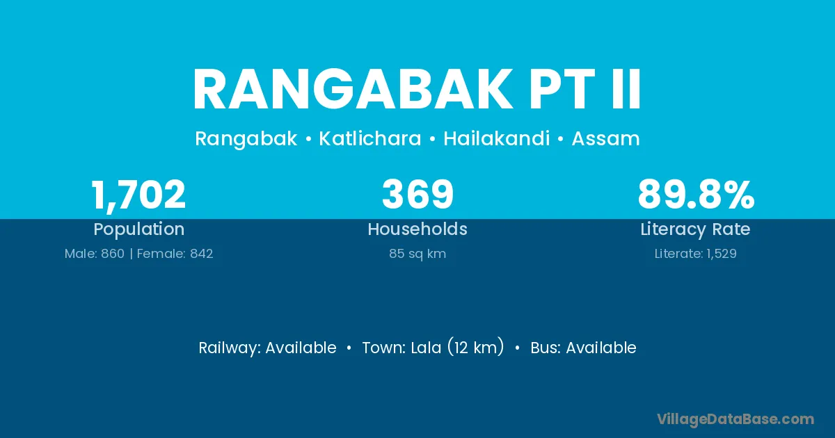 Rangabak Pt Ii village has a total population of 1,702 people, of which 860 are males and 842 are females.