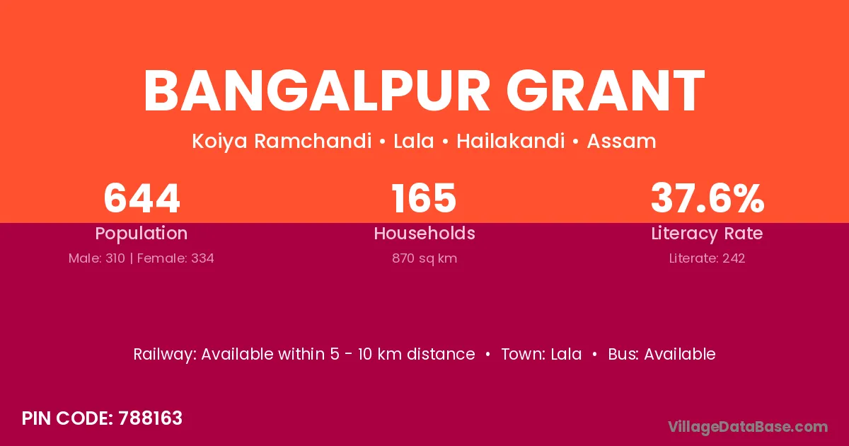Bangalpur Grant village has a total population of 644 people, of which 310 are males and 334 are females.