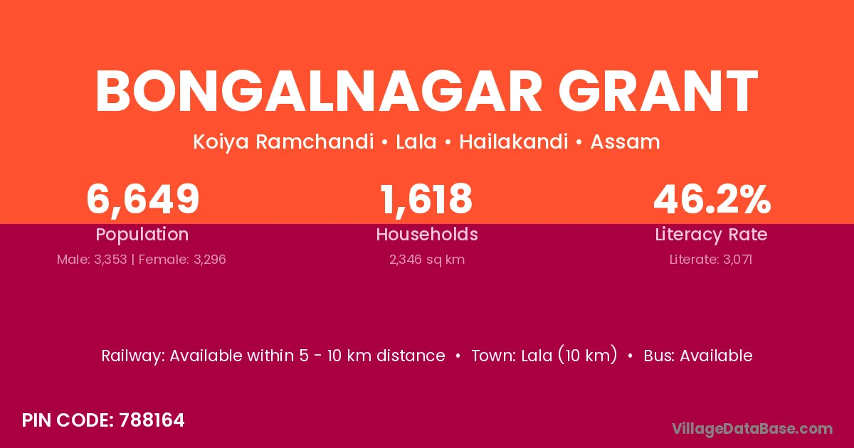 Lala (10 km) is the nearest town to Bongalnagar Grant village for major economic activities and is located approximately 10 km away.