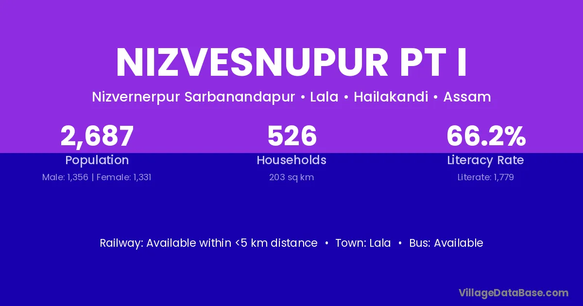 Nizvesnupur Pt I village has a total population of 2,687 people, of which 1,356 are males and 1,331 are females.