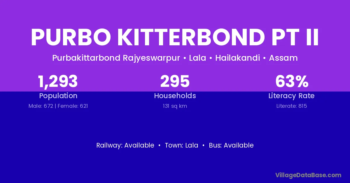 Purbo Kitterbond Pt Ii village has a total population of 1,293 people, of which 672 are males and 621 are females.