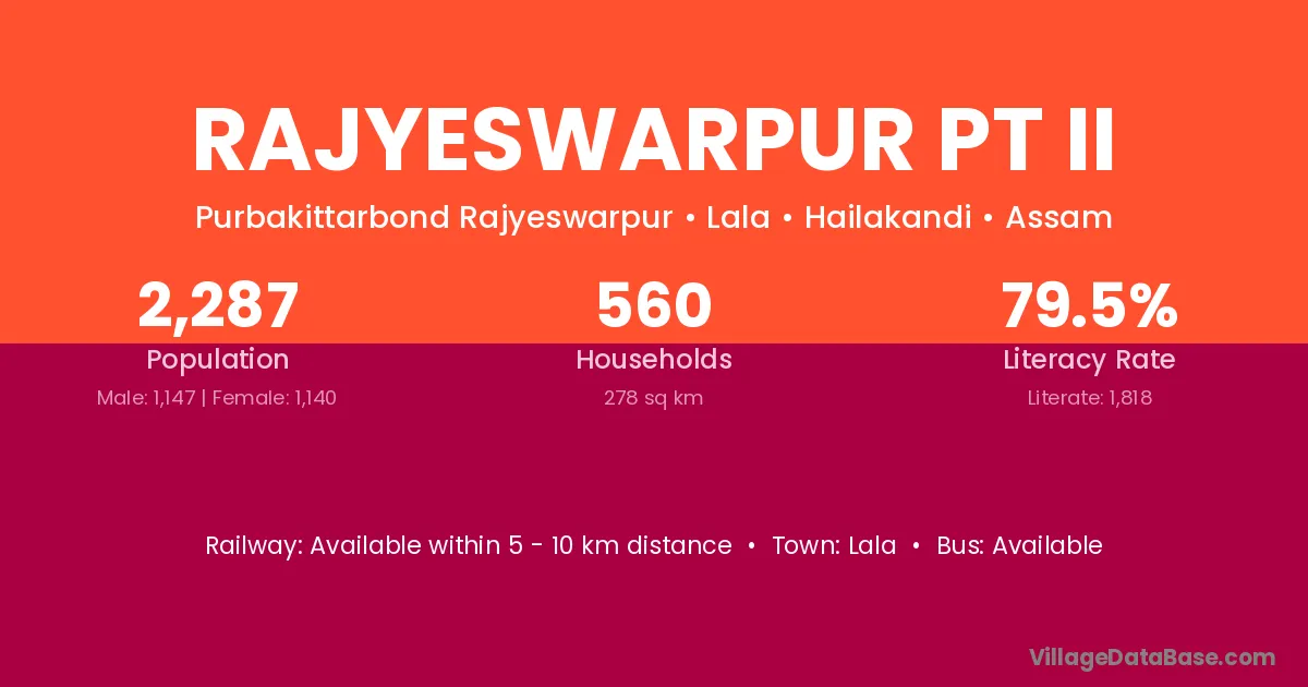 Rajyeswarpur Pt Ii village has a total population of 2,287 people, of which 1,147 are males and 1,140 are females.
