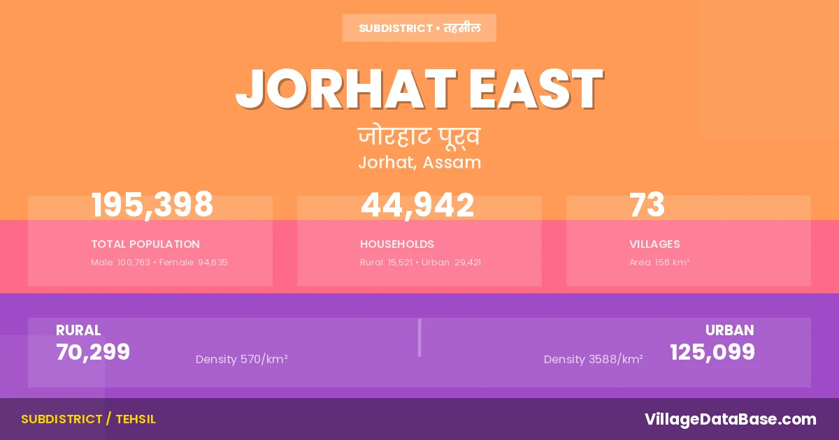 According to the 2011 census The total area of Jorhat East Subdivision is 158 km², with a population of 195398 people. The population density is 1,236 inhabitants per square kilometre, and there are approximately 44942 houses in the sub district.