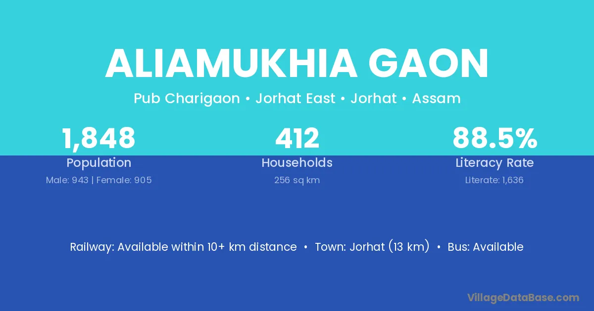 Jorhat (13 km) is the nearest town to Aliamukhia Gaon village for major economic activities and is located approximately 13 km away.