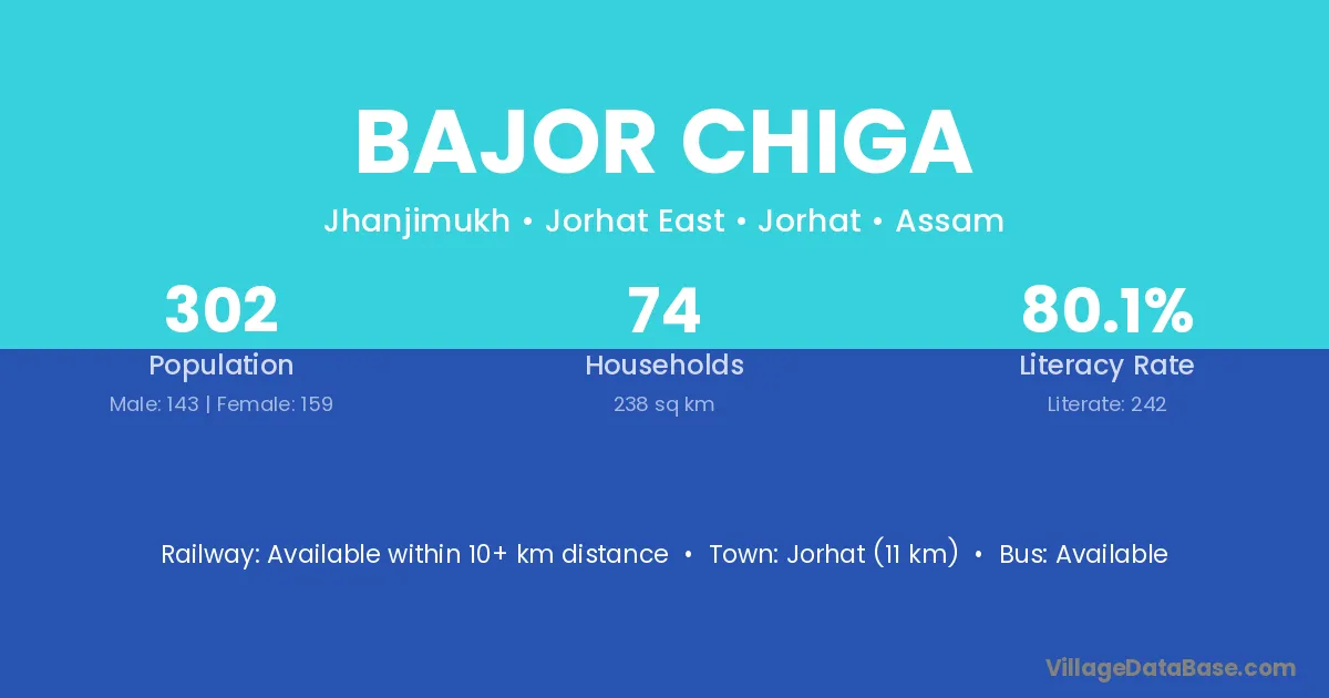 Jorhat (11 km) is the nearest town to Bajor Chiga village for major economic activities and is located approximately 11 km away.