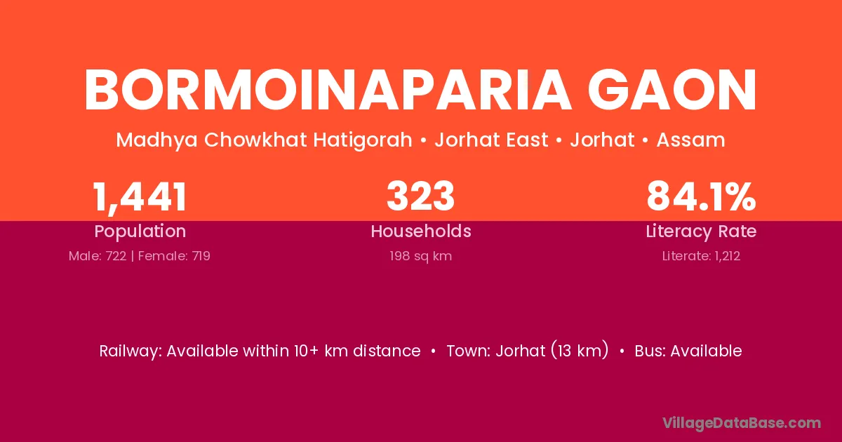 Bormoinaparia Gaon village has a total population of 1,441 people, of which 722 are males and 719 are females.