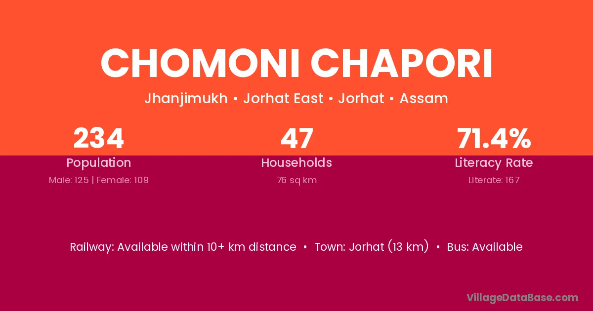 Jorhat (13 km) is the nearest town to Chomoni Chapori village for major economic activities and is located approximately 13 km away.