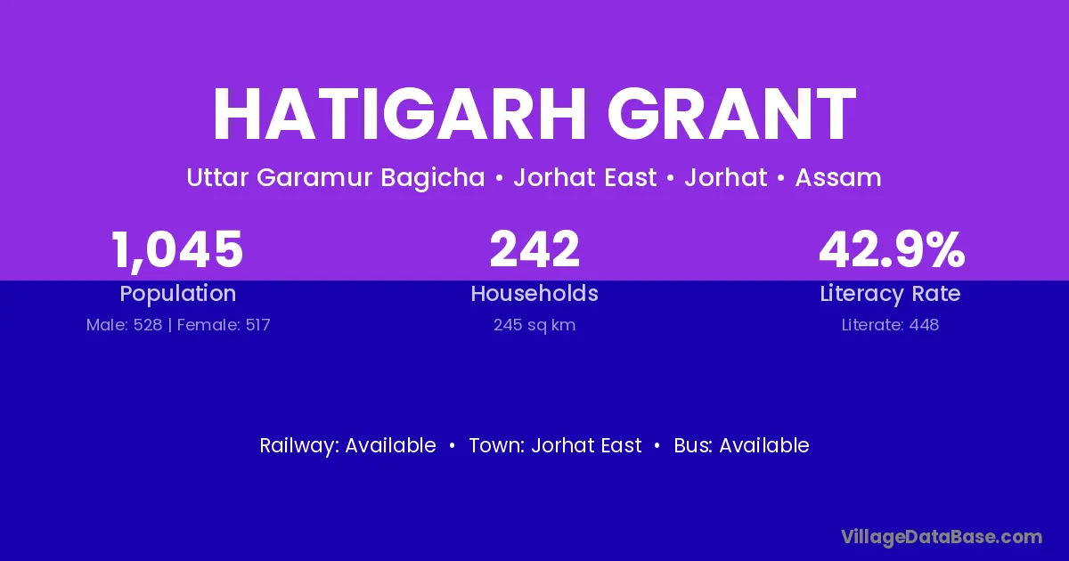 Hatigarh Grant village has a total population of 1,045 people, of which 528 are males and 517 are females.