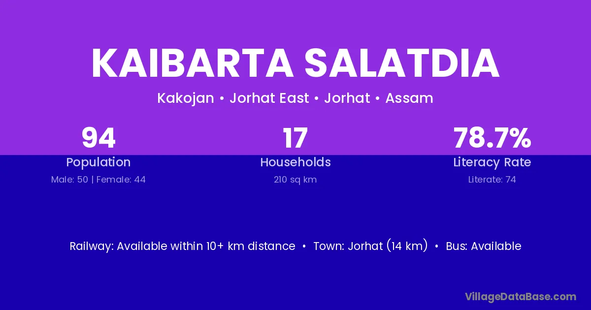 Jorhat (14 km) is the nearest town to Kaibarta Salatdia village for major economic activities and is located approximately 14 km away.