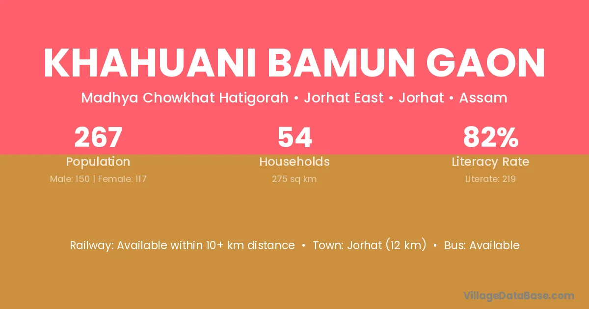 Khahuani Bamun Gaon village has a total population of 267 people, of which 150 are males and 117 are females.