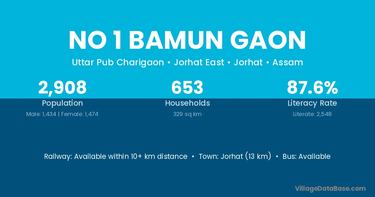 No 1 Bamun Gaon village has a total population of 2,908 people, of which 1,434 are males and 1,474 are females.