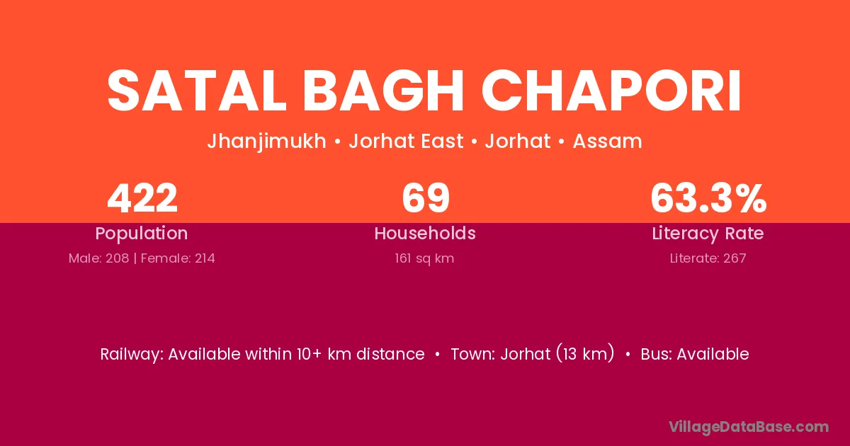 Satal Bagh Chapori village has a total population of 422 people, of which 208 are males and 214 are females.