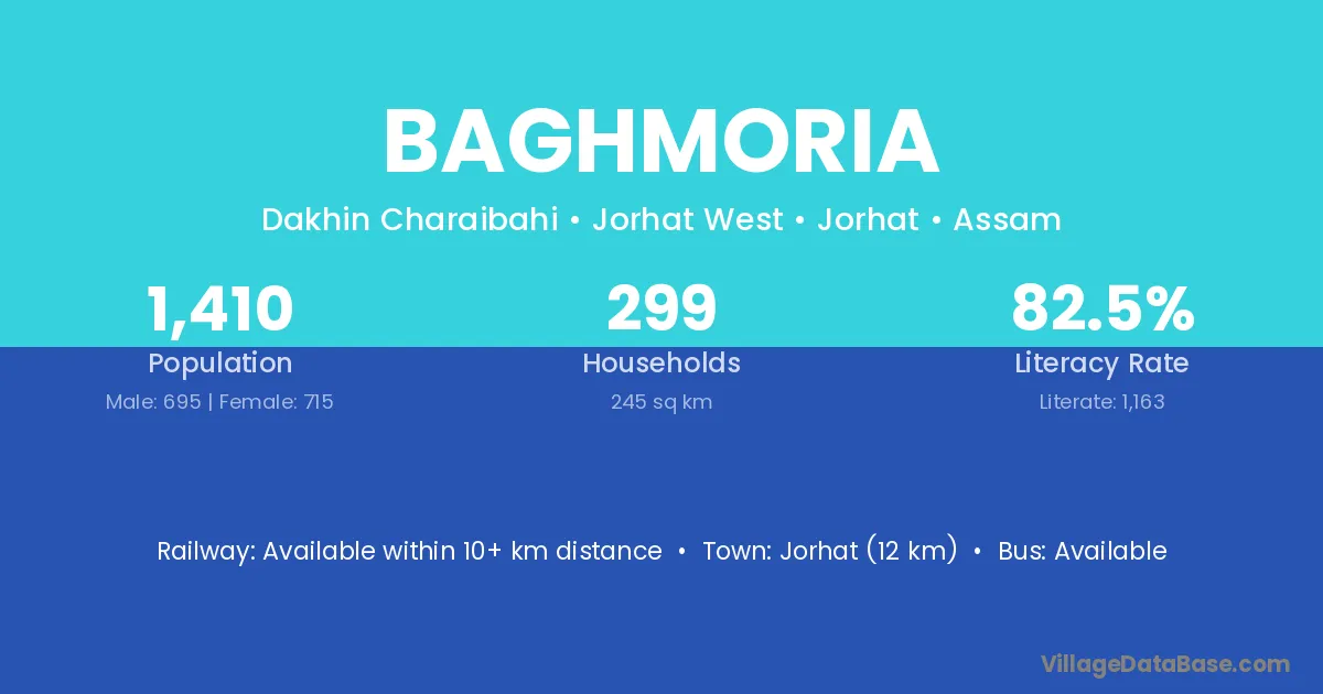 Jorhat (12 km) is the nearest town to Baghmoria village for major economic activities and is located approximately 12 km away.