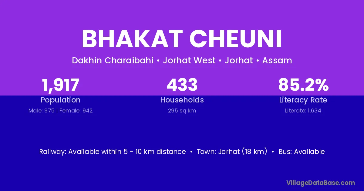 Jorhat (18 km) is the nearest town to Bhakat Cheuni village for major economic activities and is located approximately 18 km away.